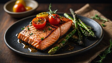 Close-up of two perfectly grilled salmon fillets, plated with roasted asparagus and cherry tomatoes, creating an appetizing and healthy gourmet meal.