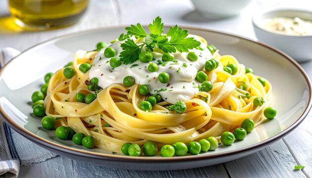 Creamy pea pasta dish with fresh herbs, featuring a light and appetizing presentation.