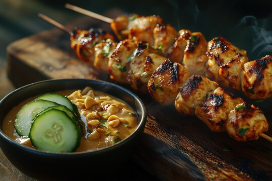 Skewer of chicken satay, golden-brown and glistening with marinade, served with a bowl of creamy peanut sauce and cucumber slices. Traditional Thai dish