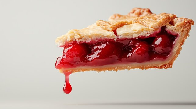 Juicy cherry pie slice suspended, sauce dripping, flaky crust and fresh cherries visible.