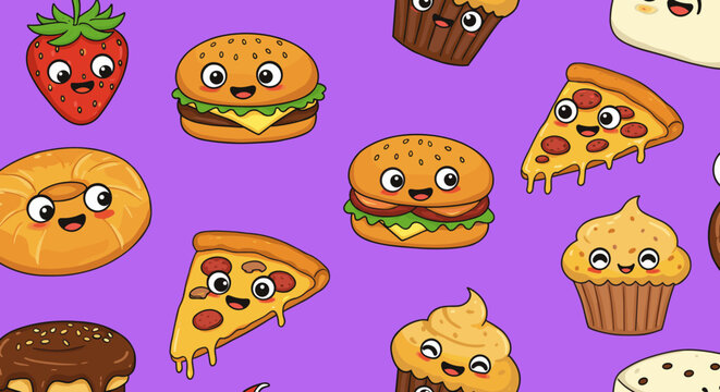 Colorful cartoon food pattern with happy burgers, cupcakes, and pizza on purple background