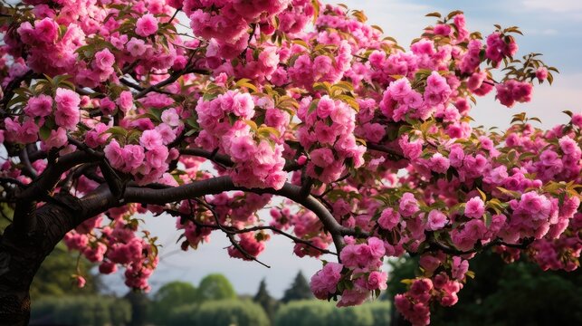 Captivating ornamental garden with blooming lush trees on a sunny day.