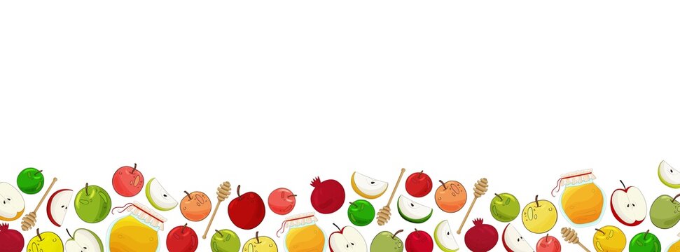 Rosh Hashana, Rosh Hashanah, Jewish New Year greeting card, cover, holiday web banner, poster. Hand drawn illustration design template with apple and pomegranate pattern in trendy modern art style