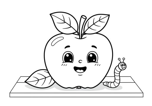 Black and white coloring book illustration, cute apple with a smiling face, sitting on a table with a few leaves and a small worm peeking out, thick smooth outlines, simple but playful style