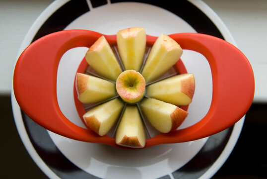 Stylized red apple core illustration with exposed flesh, seeds, and brown stem.