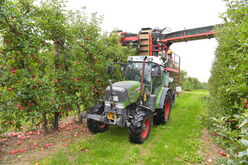 Ripe organic apples in a wooden boxes on the background of an apple orchard.