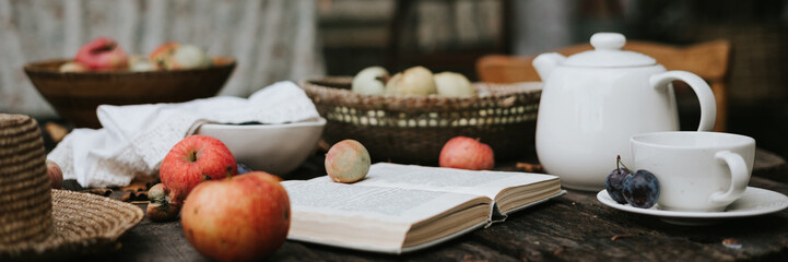 wooden table set for tea in the garden under an apple tree next to the ropes where the laundry is dried, cozy and comfortable autumn still life