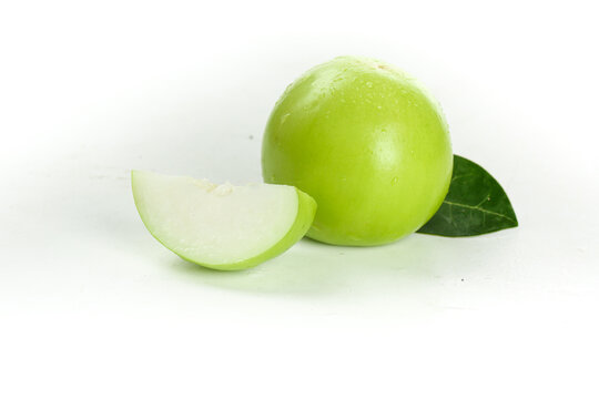 Fresh Green Jujube Guifei Taiwan Milk Apple Fruit with Slice and Leaf on White Background