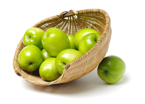 Closeup of Fresh Green jujube in a wooden bowl isolated on white background, Selective Focus.