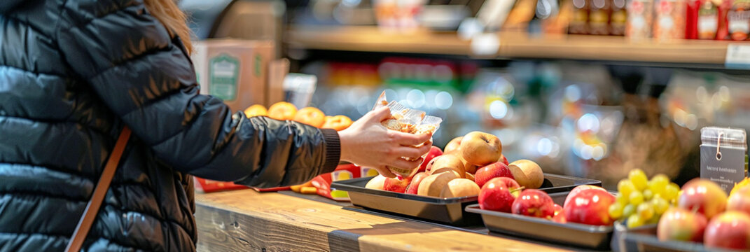 Shopping and paying at a fruit and vegetable stall in a supermarket. AI generative.