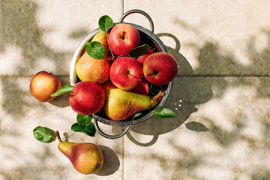 Overhead shot of ripe apples and pears with autumn leaves and berries on a dark surface