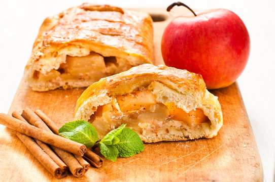 Strudel or apple pie on wooden board. Top view. Closeup.