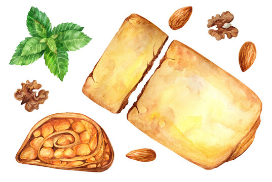 Pieces of tasty apple strudel with powdered sugar, mint and fruits on wooden table, closeup