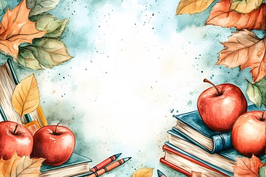 Colorful autumn frame with apples, books, and leaves suitable for school or educational events