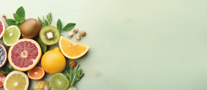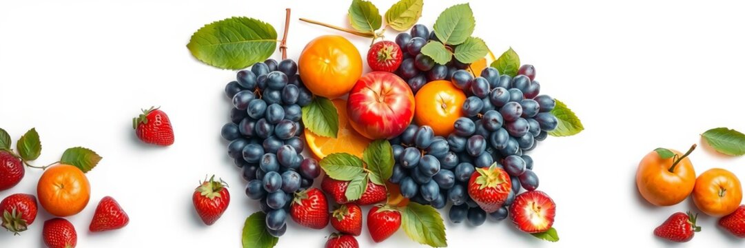 A colorful border made of fruits like apples, oranges, strawberries, and grapes on a white background with space for text in the middle, concept, apples