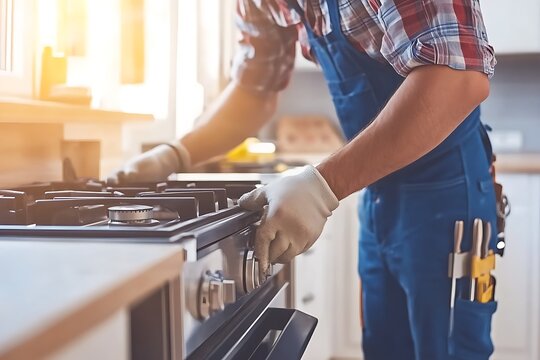 Girl in pyjamas at home fixing the stove with a pair of scissors