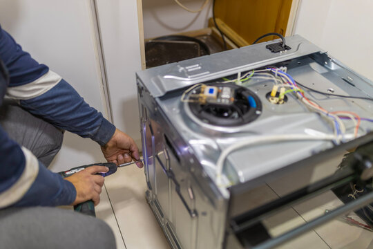Experienced repair specialist examining electrical connections and replacing faulty modules in a kitchen stove making sure the appliance operates smoothly.