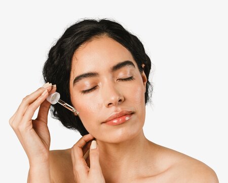 Young woman applying serum on her face isolated image