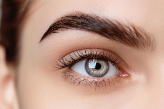 Closeup of beautiful female eye with long eyelashes and perfect eyebrows makeup