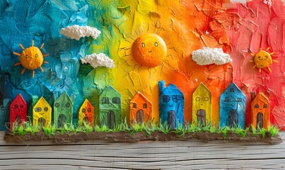 Childs drawing of town and village background. Colorful paper cut smiling houses appliques with cheerful sun and clouds in sky in rainbow colors