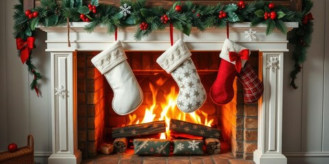 Cozy fireplace with stockings hung on a mantel, surrounded by festive fabric appliques of snowflakes, holly leaves, and berries, stockings, fabric applique, holiday season
