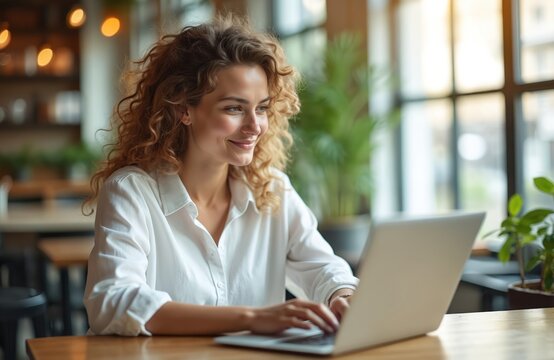 Woman schedules meeting appointment online using laptop. Curly girl works remotely at computer. She smiles, types text on keyboard. Business woman plans event in her agenda.
