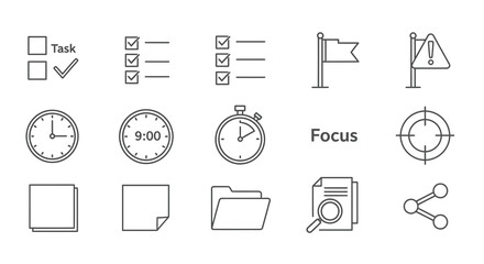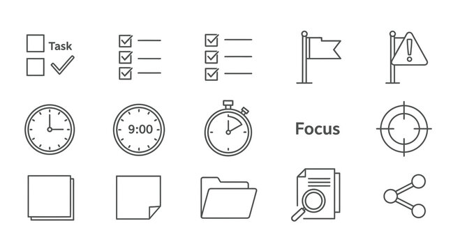 Time Management Line Icon Set. Efficient Scheduling, Productivity Enhancement, And Task Organization Outline Symbol Collection. Editable Stroke. Isolated Vector Illustration