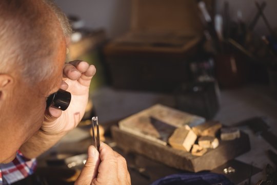 Experienced appraiser of antiques shop measuring antique vase while determining value