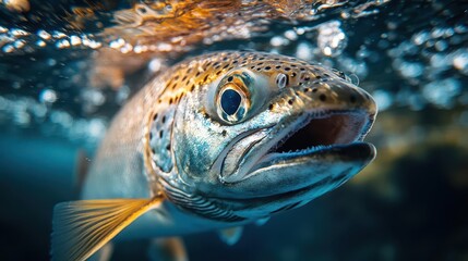 closeup of a salmon fish its scales shimmering under the waters surface in a vibrant aquaculture setting the image invites viewers to appreciate the beauty and detail of farmed fish