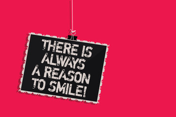 Word writing text There Is Always A Reason To Smile. Business concept for Positive thinking good attitude energy Hanging blackboard message communication information sign pink background