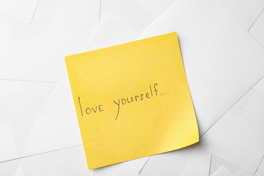 Note with words LOVE YOURSELF on paper sheets, top view