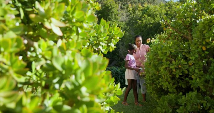 In garden, grandmother and child watering plants together, appreciating nature's beauty