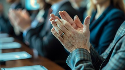 Close-up of hands clapping in a business meeting, showcasing appreciation and teamwork in a professional environment.