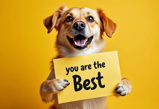 Appreciation message. Cute dog with a sign " you are the best ". Compliment, gratitude and praise concepts.