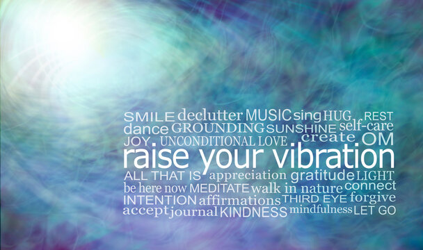 Healing Words to Raise Your Vibration from the Light Source Wall Art - white light from from blue teal energy background with a  word cloud relevant to spirituality and raising your vibration