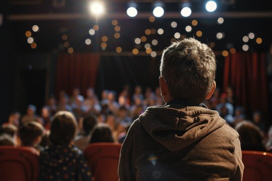 A young boy is seated in front of a crowd of people, engaging with the audience, A parent watching proudly as their child performs in a school play