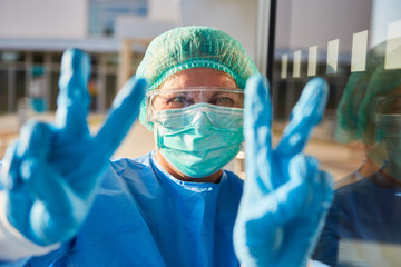 Medic in protective clothing shows victory sign as a gesture of success