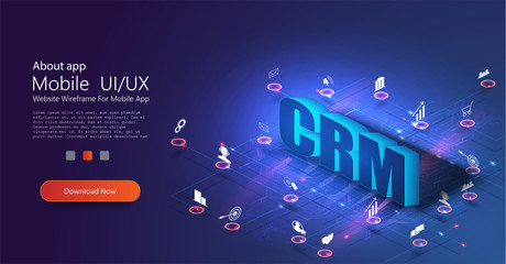 CRM isometric banner. Internet Business strategy. Customer Relationship Management concepts. Business Internet Technologies. Set of business isometric icons.  Vector illustration