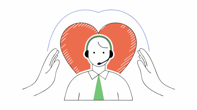 A friendly person with a headset radiating warmth and approachability positioned in front of a large heart emphasizing assistance and care.