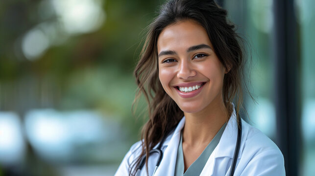 A young female doctor in a white lab coat and stethoscope stands confidently, her warm smile and professional look conveying approachability and trust.