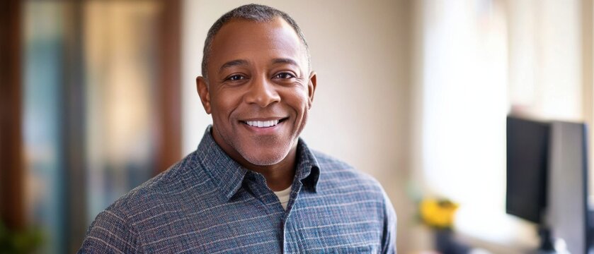Smiling African American man in his 50s wearing a casual shirt, portrait of a happy mature adult indoors at home or office, concept of confidence and positive attitude