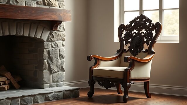Ornate carved oak armchair beside a stone fireplace with soft window light.
