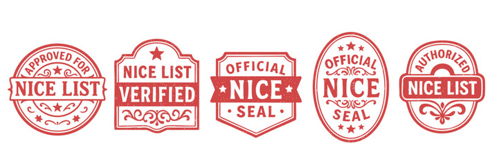 Vintage red rubber nice list approval stamps featuring santa certification labels for holiday graphics