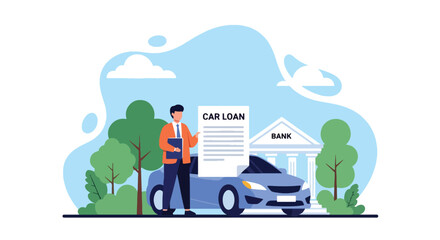 Flat vector scene of customer receiving approved car loan beside vehicle silhouette and loan document. Ideal for auto financing ads, dealership promotions, and banking loan materials