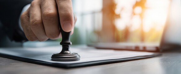 The stamp sealing an official document on a sunlit wooden office desk