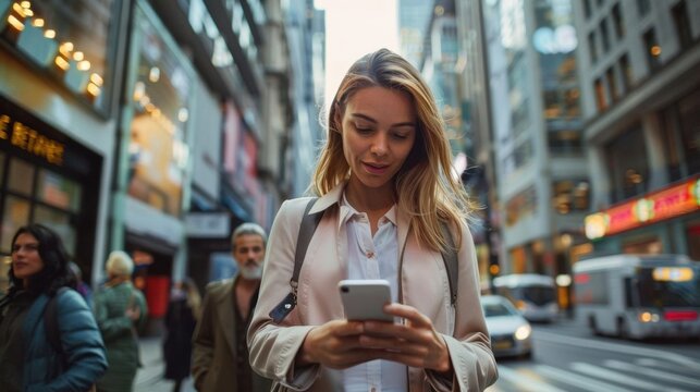 A businesswoman using a banking app to approve a loan application on the go, walking in a busy city street