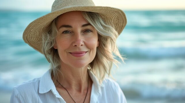 Illustration of a mature woman of approximately 50 years looking at the ocean. woman sitting on the beach in white bohemian dress with white hair and small wrinkles.