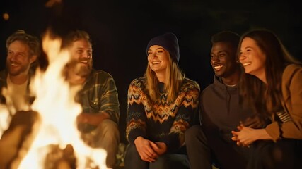 Diverse friends laughing joyfully around a campfire at night, sharing stories and good times