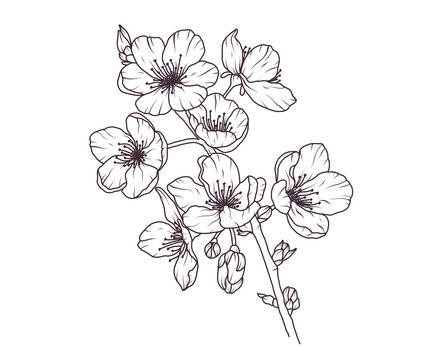 Sakura flower branch hand drawn black floral sketch. Cherry blossom japanese twigs line art. Spring botanical petal, leaves. Bloom asian plant vector illustration in outline style