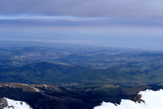 Aerial view over the Swiss Alps seen from Säntis peak at Alpstein Mountains on a sunny spring day. Photo taken April 19th, 2022, Säntis, Switzerland.